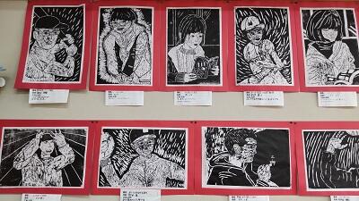 各学年版画ができあがり、いろいろなところに掲示されています。版画にもいろいろな種類があり、紙版画や木版画、切り紙版画などに挑戦したようです。