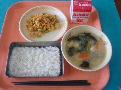 ↑ 今日の給食は、ごはん、牛乳、三色ごはん、あすか汁でした。