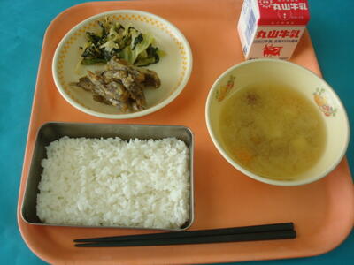 ↑ 今日の給食は、ごはん、牛乳、いわしのみぞれに、インゲンのごま和え、がんもどきの味噌汁でした。