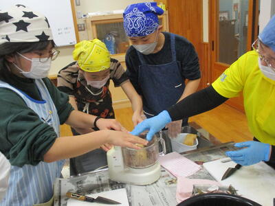 婦人会の方々と一緒に 魚のすり身体験