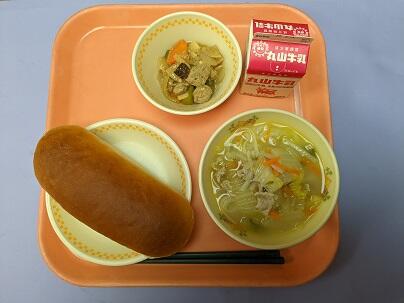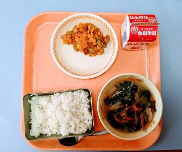 今日の献立は、ご飯、牛乳、大豆のいそ煮、白菜の酢の物です。大豆のいそ煮は、大豆、鶏肉、ゴボウ、こんにゃく、などいろいろなものが入っており、栄養のバランスがよく、とてもおいしかったです。白菜の酢の物は甘酢で子どもたちにも食べやすい味付けでさっぱりとしておいしかったです。