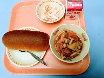 カレーライスに続いて、今日も1年生が喜びそうなメニューです。ちなみに昨日のカレーライスは、1年生も完食だったそうです。今日も完食できるかな。ごぼうナッツサラダは、噛みごたえがあるサラダで、あごが鍛えられますね。噛みごたえのある献立も考えてくださって、ありがたいです。今日もごちそうさまでした。