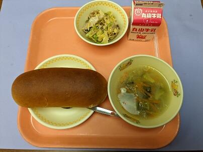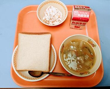 一年生は今日から給食が始まりました。ふわふわスープは、ほどよい味付けで美味しかったです。ポテトサラダサンドは、塩分控えめの薄味でした。1年生はうまくパンにはさんで食べられたでしょうか。思い出に残る給食になるといいですね。今日もごちそうさまでした。