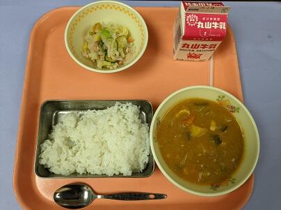 今日の献立は、昆布と大豆のカレー、牛乳、冬野菜のサラダです。今日のカレーには昆布と大豆が入っていて、初めて食べるカレーでした。食べるときは大豆のカレーなんだと思いながら食べましたが、柔らかい大豆で子どもたちにも食べやすい感じでした。昆布がはいっていることでうまみ成分もでたのか、おいしく感じました。これからいろいろなカレーのメニューが出てくるのが楽しみです。