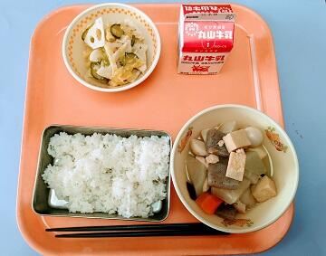 今日の献立は、牛乳、ご飯、おでん煮、レンコンサラダです。普段はなかなか食べないレンコンですが、食物繊維たっぷりのレンコンがたくさん入っていて、腸にもよいし、噛み応えもあって健康的なメニューです。おでん煮も大根を始め、野菜やこんにゃくがたくさん入っており、味も浸みており、とてもおいしかったです。