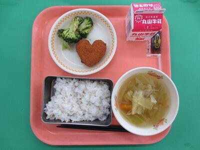 今日の献立はご飯、牛乳、ハートのコロッケ、茹でブロッコリー、白身魚のスープです。