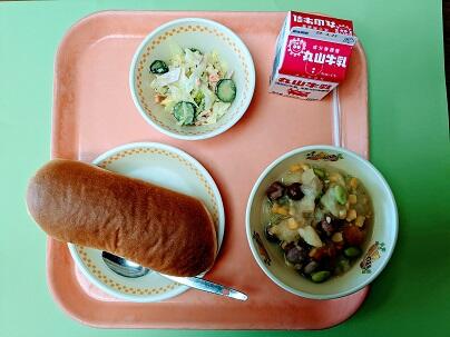 ポークビーンズは大豆が軟らかく煮てあり、トマト・ウースターソース味で子どもたちも好んで食べられる味付けでおいしかったです。ピーマンドレッシングもピーマンの苦みも感じず、キャベツやキュウリ、コーンなどの野菜をおいしくいただきました。