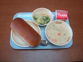 今日の献立は、黒糖パン、牛乳、クリームシチュー、新玉ねぎのフレッシュサラダでした。サラダはシャキシャキとしてて歯ざわりがよく食べられます。クリームシチューは具材の大きさも適切で、野菜や鶏肉が美味しく食べられました。パンの甘みにもよく合っていました。
