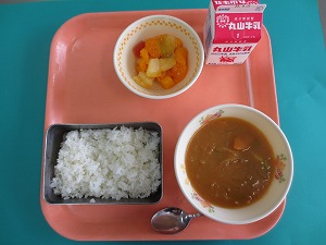 今日の献立は、カレーライス、牛乳、フルーツポンチです。