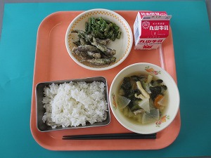 今日の献立はご飯、牛乳、いわしの梅煮、コロコロ漬け、けんちん汁です。けんちん汁は、出汁が優しい味でした。具材にも火がよく通っていて、味もよく染みていました。コロコロ漬けはキュウリがポリポリと食べられました。大豆は柔らかく煮られていました。いわしの梅煮は、そんなに酸味は感じませんでした。やわらかく甘く煮てあったので、ご飯が進みました。今日もごちそうさまでした。