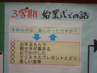1月9日から3学期がスタートしました。病気欠席の児童がいたので全員が揃っての始業式とはなりませんでしたが、元気な姿がたくさん見れてよかったです。これから寒い日が続きますが、体調管理に十分気をつけましょう。