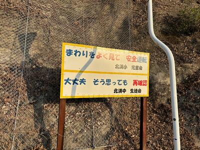↑ 新古江橋のところに設置した交通安全啓発ボードです。小中学生も利用しますので、自動車運転をする方は安全意識をさらに高めていただければ幸いです。北浦の子どもたちの命をみんなで守りましょう。