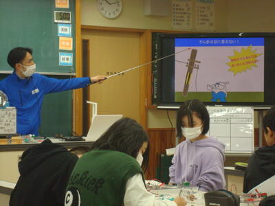 2月1日の理科の授業に、九州電力の方が福岡県から来ていただいて、電気に関する授業をしていただきました。電気の働きや電気が通るとどうなるのかなどを学習できました。電気が通ると、「光」「熱」「音」「運動」の4つの働きが出てくるという実験もしてくれました。