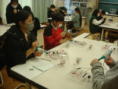 ↑ 実験道具を使って、光る、音が出る、ものが回転するというようなことを確かめています。