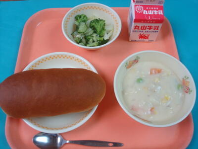 ↑ 今日の給食は、黒糖パン、牛乳、白身魚のクリームシチュー、グリーンサラダでした。