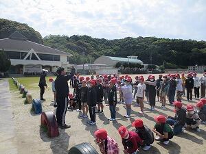 その後、津波が来るとの想定で、今度は町グラウンド上のパーキングに避難します。全員で移動するのでどうなるかと思っていましたが、6年生が1年生のお世話をするなどして、整然と避難場所まで移動することができました。