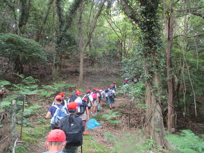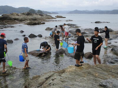 春の遠足で、5・6年生は宮野浦地区の大間海岸へ行きました。学校から宮野浦地区まで歩き、そこからお遍路道を通って大間海岸に出ました。お遍路道では、最初100Mぐらいは緩やかな登りでしたが、その先は急こう配で、私は息がハアーハアーと上がる状態でした。子どもたちは、波打ち際で、生き物を探したり捕まえたり、砂を掘って何かを作ったり、海につかったり(水着持参)と、大間海岸で楽しく過ごしておりました。夢中になっている表情が素敵でした。