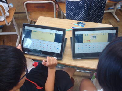 3・4年生の総合的な学習の時間で、4年生が3年生へタブレット端末にインストールしてある学習支援ソフト「ロイロノート」の使い方を教える機会を設けました。このロイロノートは、意見交換とか話し合い活動のときに有効かなと思っているところです。指導者からの指示でも活用できます。