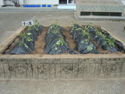 パート1 今度の方法は、学級の花壇にマルチをはって苗を植えていく方法です。この花壇あたりにはシカが出ないということなのでということでした。順調に育ってくれるといいです。