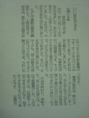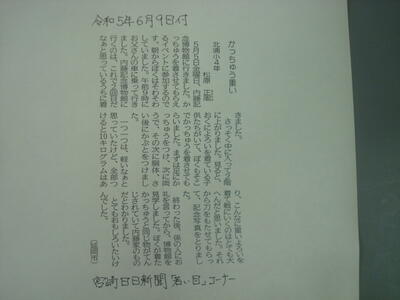 6月16日の宮崎日日新聞「若い目」コーナーに作文が掲載されました。バレー少年団の大会参加に関する作文です。試合の流れがよく分かる作文です。しかも、練習の成果が試合で出せたことは自信になったことでしょうね。