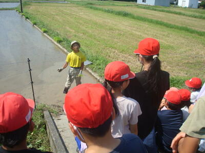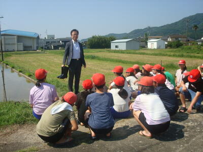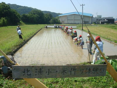 6月19日の総合的な学習の時間で田植え体験をしました。保護者の松原さんの田んぼをお借りして、松原さんらに指導いただきながら田植えを行いました。