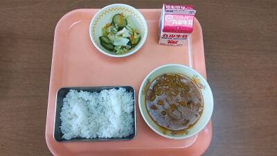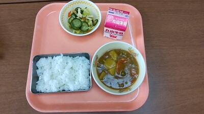 今日の献立は、北川小学校のリクエスト献立:牛乳、カレーライス、キャベツのレモン和えです。