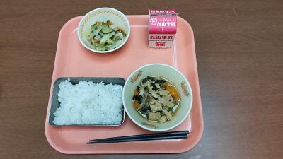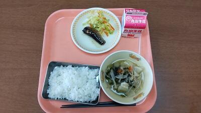 今日の献立は、ごはん、牛乳、豚肉と厚揚げの味噌煮、いそか和えです。味噌煮にはたくさんの旬の野菜が入っていますが、子どもたちが食べやすい味付けになっています。とてもおいしかったです。
