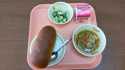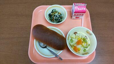 今日の献立は、いもっこパン、牛乳、鶏肉のレモン和え・ブロッコリー、野菜スープです。