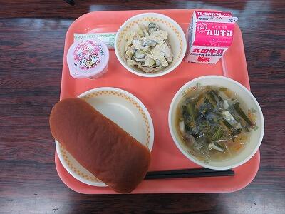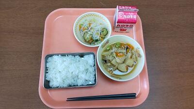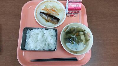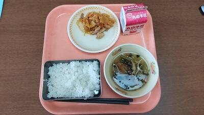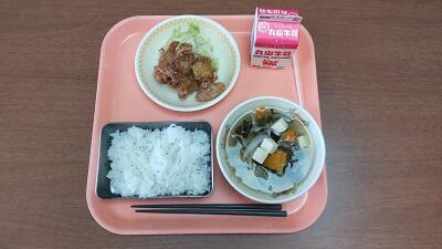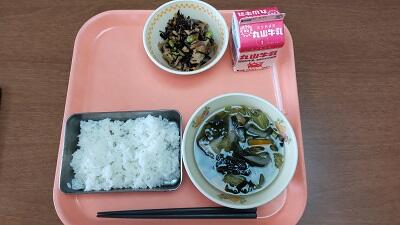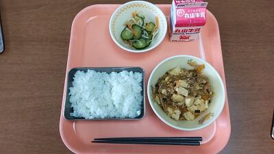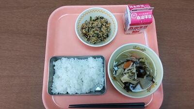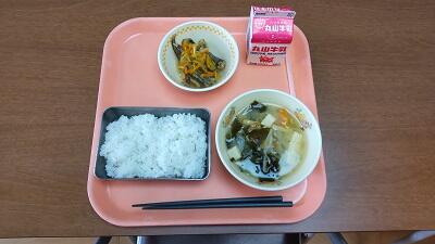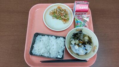 今日の献立は、ごはん、牛乳、厚揚げと小松菜の肉味噌炒め、茎わかめの酢の物です。