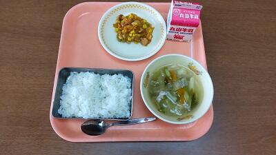 今日の献立は、牛乳、炒めビビンバ、わかめスープです。わかめスープには旬のタケノコがたくさん入っていて、春を感じることができました。