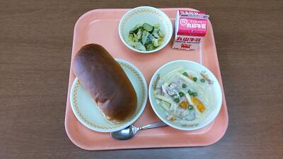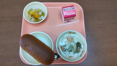 今日の献立は、ミルクパン、牛乳、クリームシチュー、フルーツナタデココです。今日はちょっと肌寒かったので、クリームシチューで体が温まりました。初めて給食を食べる1年生も食べやすいメニューだったと思います。残さず食べれたかな?