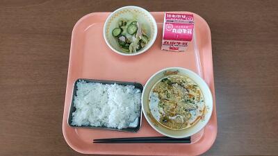 今日の献立は、親子どんぶり、牛乳、ごまじゃこ和えです。シャキシャキのキャベツなどの野菜に、ちりめんが入ったごまじゃこ和えはさっぱりしておいしかったです。親子どんぶりも少し甘めで、子供たちには食べやすい味付けでした。おいしかったです。