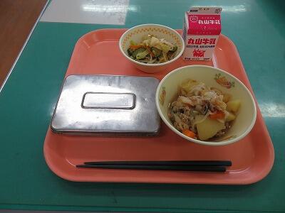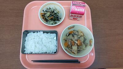 今日の給食は、ごはん、牛乳と、肉じゃがとおかかあえの和食メニューでした。おかかあえはもやしのシャキシャキとした歯ざわりがよく、肉じゃがは食材に味がよくしみていて、ご飯がすすみました。食べ終わって気付いたんですが、写真を撮るとき、ご飯箱のふたをしたままでした。申し訳ありません!!