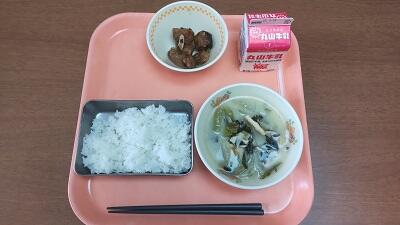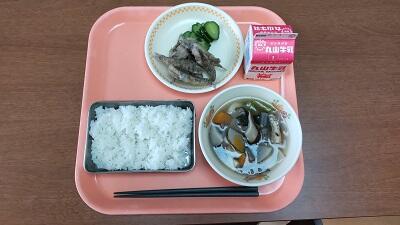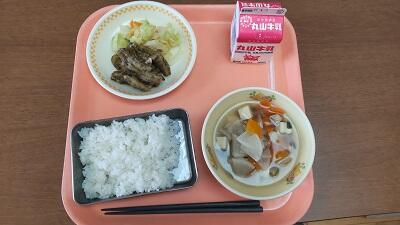 今日の献立は、ごはん、牛乳、いわしのカボスレモン煮・ごまずあえ、鳥ゴボウ汁です。
