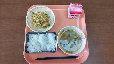 今日の献立は、チーズパン、牛乳、豆腐のチリソース煮、青豆サラダです。豆腐は『体を作るもとになる食品』です。青豆サラダにも青豆がたくさん入っていて、成長期のこどもたちとっては、タンパク質を多く摂取するうえでは最高の献立です。残さずしっかり食べて体を大きくしてほしいと思います。