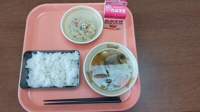 今日の献立は、キムタクごはん、牛乳、魚そうめん汁です。今日は令和4年度初めての給食です。久しぶりの給食はとてもおいしかったです。キムタクごはんは、キムチとたくあんがとても合っていて、白ごはんが進みました。考えた人はすごいなと思います。給食に感謝!1年間よろしくお願いします。