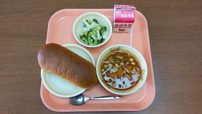 今日の献立は、牛乳、ミルクパン、ポークビーンズ、つぼみふっくらサラダです。ポークビーンズは大豆がとても柔らかく煮てあり、子どもたちにも食べやすく、トマトやニンニクの風味がしっかりして、とてもおいしかったです。