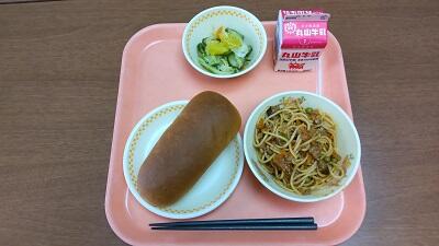 今日の献立は、減量コッペパン、牛乳、ナスと挽肉のスパゲティ、あま夏みかんサラダです。子どもたちが大好きなスパゲティ、昔の柔らかな太麺ではなく、細くて少し堅めの麺でした。にんにく、赤ワインも入っていて、風味がとてもよかったです。もちろんおいしかったです。