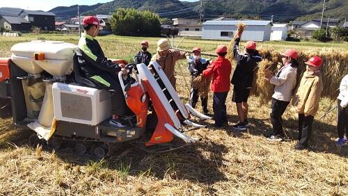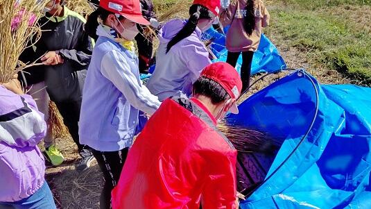 今日は稲刈りをして天日干しをした稲穂から籾を取り除く脱穀に5年生が挑戦しました。保護者の松原さんが今回は千歯扱き、足踏み脱穀機、コンバインの3種類を準備していただき、それぞれを子どもたちに体験させながら脱穀を行いました。千歯扱きは脱穀できる量が少ないので、昔の人々の苦労が実感できたのではないでしょうか。足踏み脱穀機は、千歯扱きよりもかなり脱穀でき、慣れたらどんどん脱穀を進めることができました。現代の脱穀、コンバインを使っての脱穀はかなり早くて、袋にも勝手に詰められるので、脱穀の進歩というのも実感したのではないでしょうか。