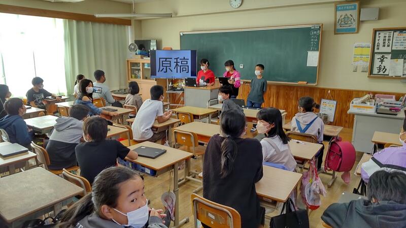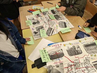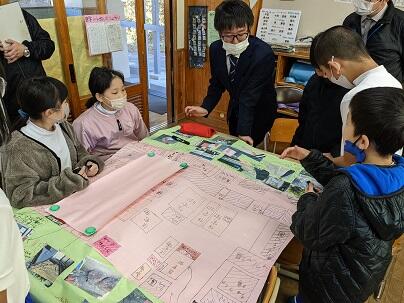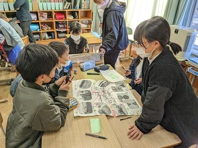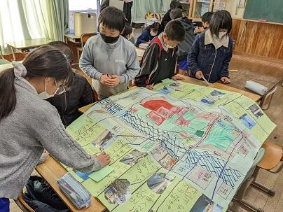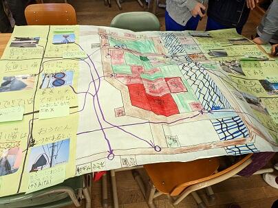 子どもたちは、地域の危険箇所などを示す地図を協力して作っており、今日の授業では誰でもその危険箇所が分かり、アドバイスや呼びかけが入った防災マップに作り替える内容でした。子どもたちは一生懸命意見を出し合い、いろいろなメッセージを書きました。この授業後には、この地図をもとに地域の防災についての発表を行う予定です。とても楽しみですね。