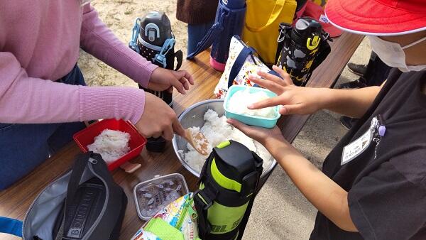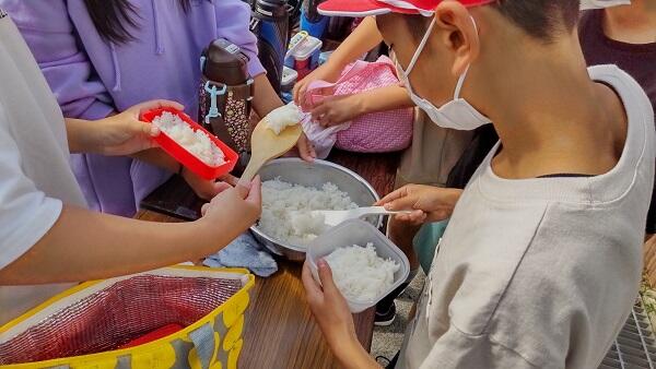 5年生が収穫したお米を羽釜で炊きました。お米をきれいに洗い、お水を入れ、マッチで火を付けて薪を燃やしてお米が炊けるのを待ちました。白米がきれいに揃って立っていて、ピカピカした姿は、見た目でもおいしそうで、実際食べても本当においしかったです。お焦げも入ってなかなかの味でした。子供たちは自宅からもってきたおかずと一緒に食べました。なかなかこのような機会はないのでとても貴重な体験となりました。自然の恵みに感謝ですね。