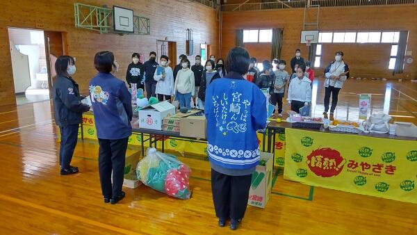 今日は県の学校給食会が主催で「ひむか地産地消交流給食会」が行われました。体育館には野菜や椎茸、魚のブースが設置され、まずは3校時に5・6年生がブースごとに担当者の方からお話を聞きました。事前に質問内容を担当の方へ送り、その質問に答えるような流れでいろいろなことを教えていただきました。子どもたちはとても真剣な顔で聞いていて、とてもよい経験ができたなと感じました。そのほかの学年も4校時目に展示物の説明を聞いたり、鰹の一本つりの体験をしたりして地産地消についての学習を深めました。