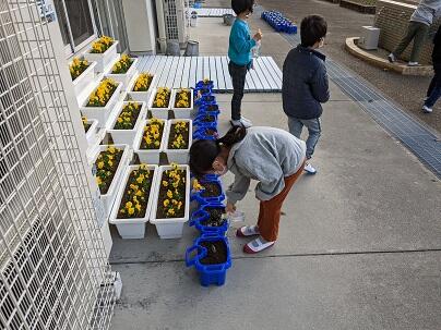 渡部先生が種から育てた花の苗が移植できるくらいに大きくなりました。各学年の学級園に、パンジーなどの花を子どもたちが移植しました。これから少しずつ日も長くなり、温かくなるので生長が楽しみです。