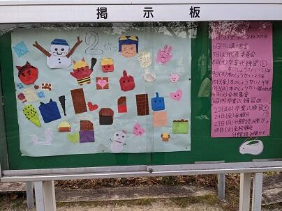 折り紙などで雪だるま、節分の鬼や豆、バレンタインデイのチョコレートなどが掲示されています。かわいく2月の飾りができあがりました。明日は節分で、教室で豆まきも行われると思いますが、豆まきで教室から邪気を追い払ってほしいと思います。14日はバレンタインデイですが、男子はチョコをいくつもらえるかな?楽しみですね。1月はあっという間に過ぎました。2月はもっと早く過ぎます。しっかり3学期のまとめをし、次の学年の準備も始めてほしいと思います。
