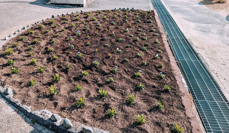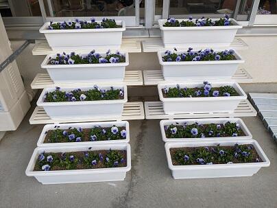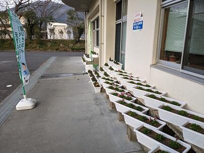 それ以外にも校舎の南側にはたくさんのプランターも設置されて。薄紫、黄色、白色のパンジー、薄紅色のペチュニア、キンギョソウなどが育っています。