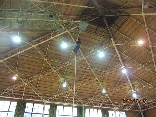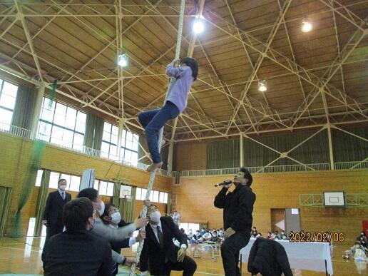 最後には体育館の天井からつり下げたロープを使って、「SASUKE」のファイナルステージをイメージしたロープのぼりを6年生と行いました。6年生が5名挑戦し、洸牙くんがかなり高くまで登りました。最後に長野さんに登ってもらいましたが、たかさ15m位の高さまで簡単にするする登り、子どもたちも先生方もあっと驚かされました。あまりの速さに度肝を抜かれました。