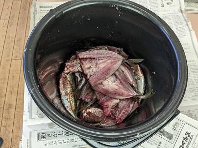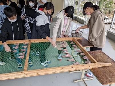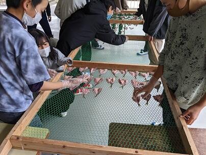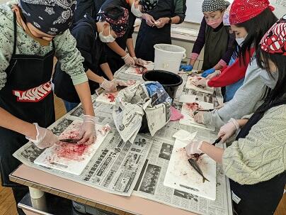 北浦の地域婦人連絡協議会の協力を得て、アジの干物作りに6年生が挑戦しました。婦人会の方からアジの開き方を学び、小出刃包丁を使って一人一人捌きました。はじめは慣れない手つきでしたが、何匹もあつかっていたらどんどん上達し、きれいに捌くことが出来ました。捌いたアジは塩水につけて、2時間後に網の上に干しました。今日はあいにく曇りなので干すのに時間がかかりそうですが、できあがりが楽しみです。婦人会の皆様ご指導ありがとうございました。