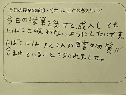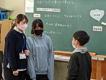 子どもたちは、たばこを吸った後に血管が収縮するビデオをみて、有害物質が多く含まれ、ガンなどになりやすいとか、たばこを吸うきっかけについても考え、うまく断る仕方を実際にロールプレイングしながら学んでいました。