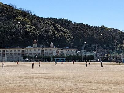 1年生が凧あげをしていました。昼間の気温も上がり、風も吹いていたので凧あげにはベストコンディション。低空飛行する凧やかなり上空を飛んでいる凧もあり、楽しい時間を過ごしていたようです。