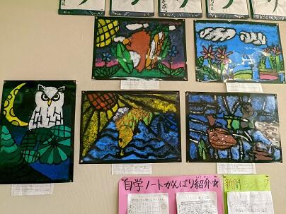 3年生がステンシル版画に取り組みました。下絵を上手に描き、描いた絵に切り込みをして、あいたところに色を付けたりしながら、作品を仕上げました。一人一人個性ある作品が仕上がってとてもすばらしいです。